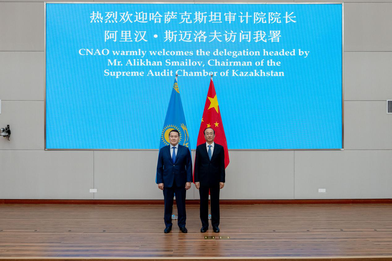 Mr. Hou Kai, Auditor General of the National Audit Office of China, met with Mr. Alikhan Smailov, Chairman of the Supreme Audit Chamber of Kazakhstan, in Nanjing on 23 September 2025. Mr. Hou Kai and Mr. Alikhan Smailov exchanged views on furthering practical cooperation both bilaterally and under frameworks of ASOSAI and Shanghai Cooperation Organization.