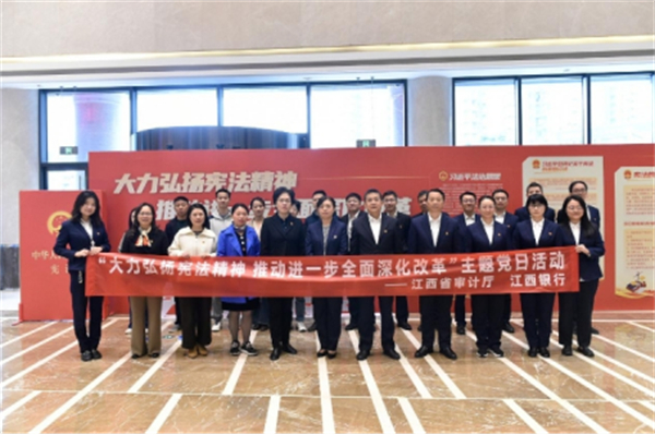 江西省審計廳法規和審理處、金融處黨支部與江西銀行相關部門黨支部聯合開展“大力弘揚憲法精神,推動進一步全面深化改革”主題憲法宣傳黨日活動。參加活動的全體黨員駐足參觀“憲法宣傳周”宣傳展板,聆聽講解。觀看憲法宣傳片,了解憲法在維護國家穩定、保障人民權益、推動社會進步等方面的重要作用,對憲法有了更加深入的認識和理解。此外還向現場辦理業務的客戶發放憲法、民法典、審計法、反洗錢、反詐等宣傳折頁,并進行法律法規知識問答等普法宣傳活動,受到客戶一致好評。