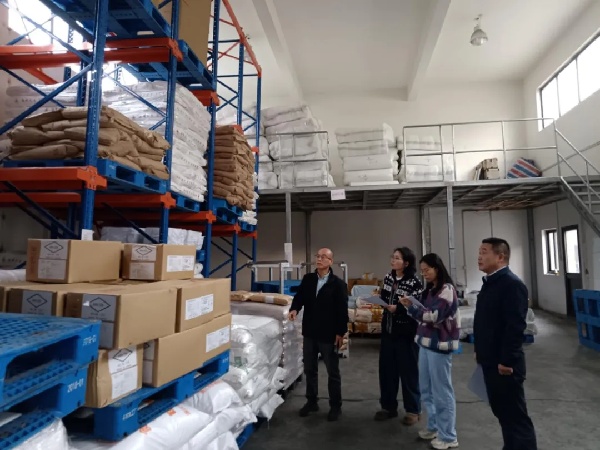 徐國增(左一)和同事現場查看包裝物料管理情況