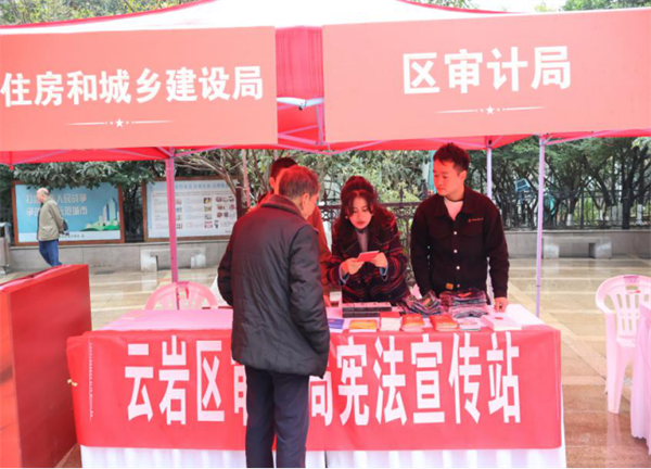 六盤水市、遵義市紅花崗區審計局開展“憲法進萬家”活動,到“雙聯雙促”聯系點的村居社區開展“憲法宣傳周”集中宣傳活動。審計干部深入沿街商戶、周邊小區等針對社區群眾關注的法律熱點問題進行答疑解惑。