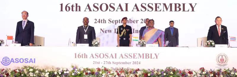 2024年9月24日,(前排左起)中國審計署審計長侯凱、印度審計署審計長吉里什·穆爾穆、印度總統德勞帕迪·穆爾穆、泰國審計委員會主席查那泰·因達拉出席亞洲審計組織第16屆大會開幕式。