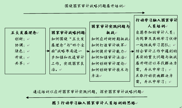 (4)能否有力服務新常態下的國家發展需求并逐步實現國家審計總體目標,取決于審計組織的行動,這驅使審計人員針對難題和挑戰采取行動并從行動中學習。綜上所述,國家審計人員培訓已具備了行動學習要素。