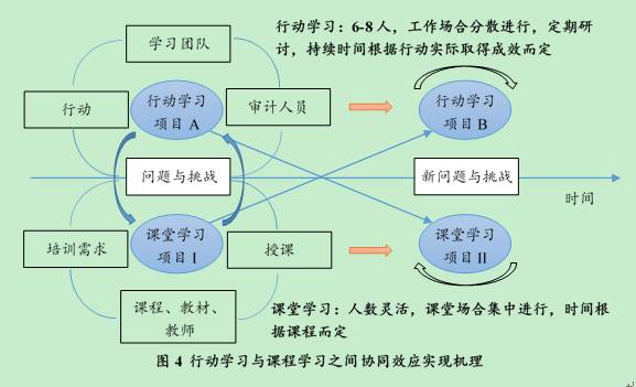 審計職業培訓與審計教育需發揮課堂學習與行動學習協同效應,才能有效解決審計能力迅速提升,適應新常態下的審計目標,如圖4所示。