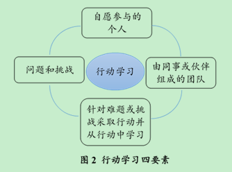 行動學習由英國管理學教授雷金納德·瑞文斯在1960年代末提出,其核心理念是人們在解決實際問題的行動中學習得更好更快。行動學習使得人們一起在行動和學習之中相互交流、相互支持和相互挑戰,其基本原理如圖2所示(佩德勒&阿博特,2015,p.14)。